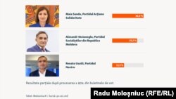 Dacă situația sugerată de rezultatele parțiale se menține, urmează să aibă loc turul doi de scrutin al prezidențialelor, pe 3 noiembrie, între Sandu și candidatul socialiștilor, Alexandr Stoianoglo.