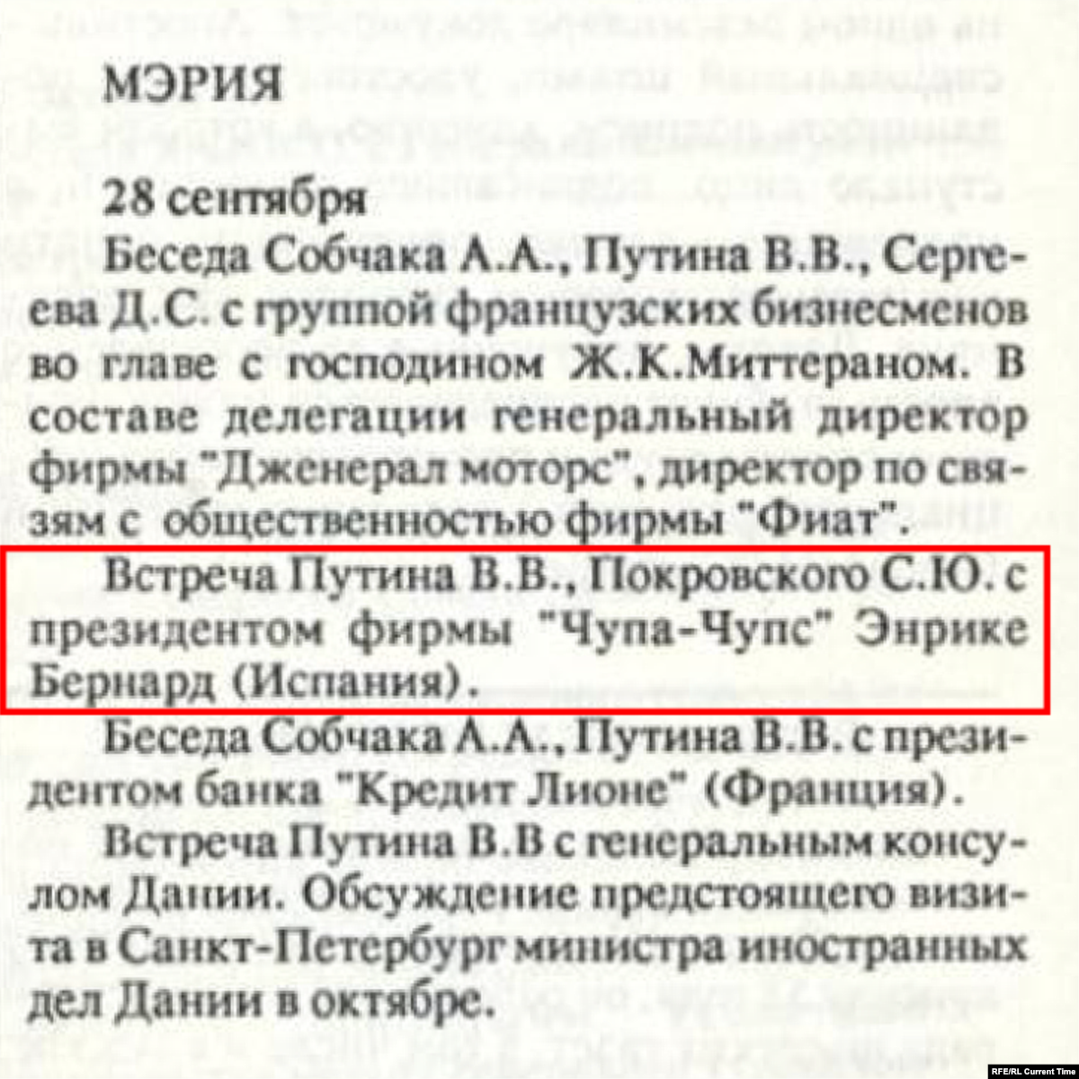 28 сентября 1992 года Путин вместе с председателем комитета мэрии по продовольствию Сергеем Покровским встретился с президентом фирмы "Чупа-Чупс" Энрике Бернатом (в бюллетене фамилия каталонца Берната написана на кастильский манер, "Бернард"). Именно Бернат, внук основателя кондитерской компании "Гранха Астуриас" был человеком, придумавшим карамель на палочке, – чтобы родителям не приходилось каждый раз отстирывать вещи своих детей, которые ели конфеты руками и вытирали руки об одежду. Чтобы вывести "Чупа-Чупс" на международный рынок, в конце 1960-х годов Энрике Бернат пришел к своему старому другу, художнику Сальвадору Дали. Легенда гласит, что Дали по его просьбе буквально за несколько часов создал логотип конфет, который дошел в практически неизменном виде до наших дней – не скрывая, что берется за этот заказ ради денег.