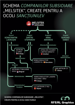 Bazându-se pe registre oficiale, jurnaliștii de la „Sistema” au alcătuit o schemă ce ilustrează structura rețelei internaționale create de „Melsitek” pentru a evita sancțiunile și pentru a continua operațiunile în piețele restricționate.
