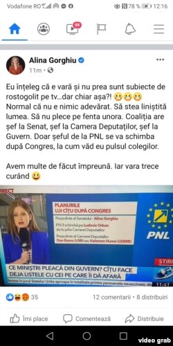 Mai mult chiar, Alina Gorghiu, fostă șefă PNL unsă pe post de însuși președintele țării (și încă, se pare, în grațiile lui), care a făcut sistematic campanie pentru Cîțu, râde acum de zvonurile conform cărora alegerea unui nou șef la PNL (dă ca sigură schimbarea lui Orban, cu tot cu „suflul lui învechit”) ar aduce și schimbări în structura parlamentară (adică, pe scurt, schimbarea lui Orban de la conducerea Camerei Deputaților).