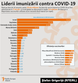 România se află pe locul 4 în Europa, în ceea ce privește numărul dozelor de vaccin anti-Covid administrate la 100 de persoane (5,59 persoane), arată estimările realizate de Bloomberg. Potrivit platformei RO Vaccinare, citată de Digi24, la nivel mondial, România se află pe locl 6 după numărul total al dozelor administrate, cu peste un million.
