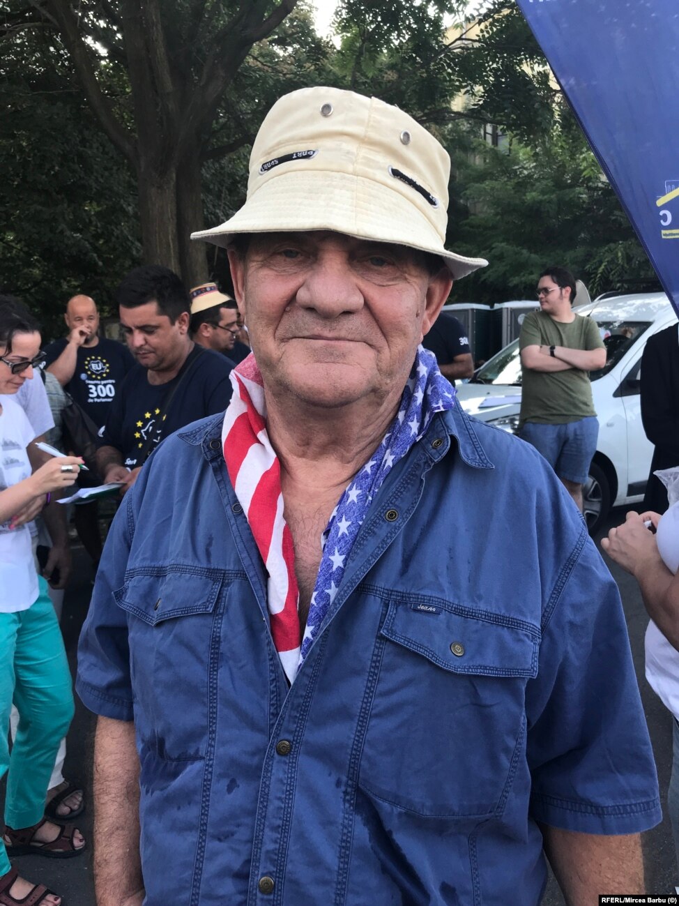 Silviu Dumitrescu, 75 de ani, pensionar, spune că drapelul american îl reprezintă mai degrabă decât cel rusesc. „Am venit pentru că eu cred că noi, românii, am trecut printr-un regim dur pentru țară și mi se pare că la putere sunt to aceiași oameni care au ocupat funcții înainte de 89. Poate generația voatră reușește!”