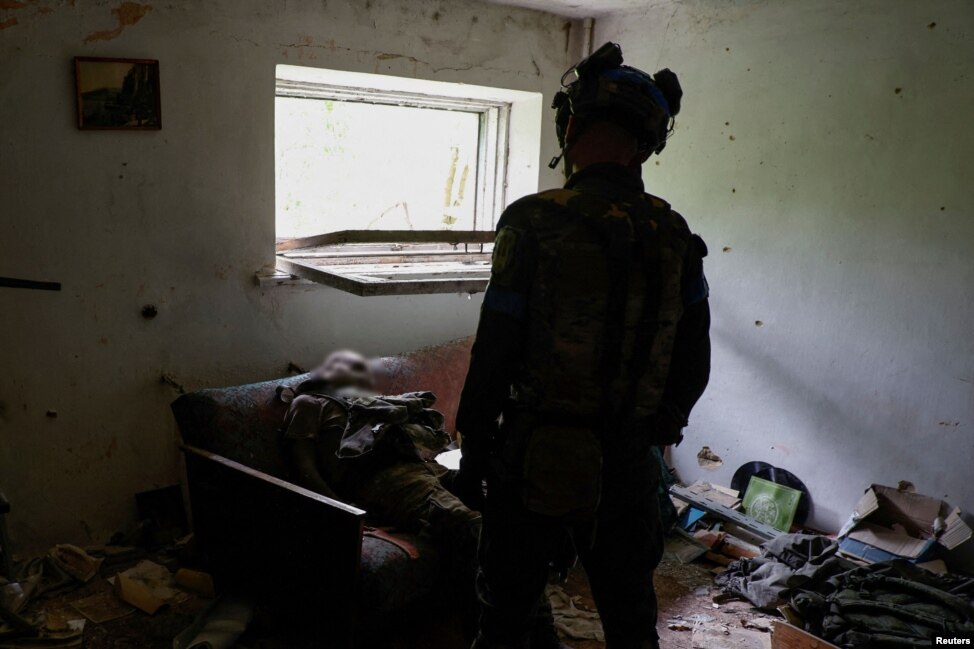 Un soldat ucrainean se află lângă cadavrul unui alt militar rus.