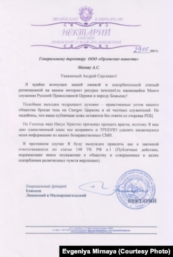 "Я крайне возмущен вашей лживой и оскорбительной статьей, размещенной на вашем интернет ресурсе newsorel.ru касающейся Моего служения Русской Православной Церкви и народу Божьему!