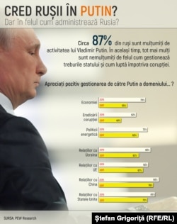 Centrul de cercetări sociologice PEW, a difuzat astazi un sondaj realizat in Rusia, din care reiese ca rușii continuă să aibă încredere în președintele lor, dar nu cred că ar putea să biruie în lupta cu corupția.