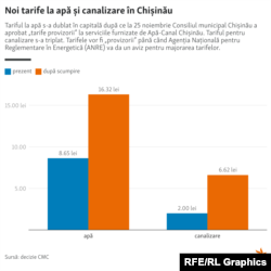Consiliul municipal Chișinău a aprobat vineri, 25 noiembrie, „tarife provizorii” la serviciile furnizate de Apă-Canal Chișinău. Consumatori casnici ar urma să plătească pentru apă și canalizare cu 12 lei mai mult. Decizia a fost votată de consilierii socialiști, democrați, comuniști și trei neafiliați. Fracțiunea PAS calificat-o drept ilegală.