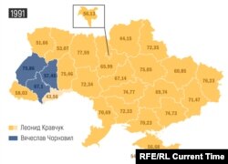 Леонид Кравчук занял первое место во всех регионах, за исключением трех областей: Львовской, Ивано-Франковской и Тернопольской, где победил Вячеслав Чорновил.