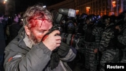 Фотограф агентства "Рейтер" Глеб Гаранич, получивший ранение во время столкновений на Майдане, фотографирует бойцов спецсподразделений.