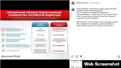 Într-o postare de pe 1 iulie, Ahremțev a atașat un infografic în care explică, și în română, care este diferența dintre procedura generală de obținere a cetățeniei ruse și cea simplificată, pe care o promovează.