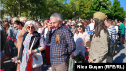 Cei care poartă „panglica sf. Gheorghe” la marșul din Comrat sunt în minoritate. Cei mai mulți participanți la marș au venit cu flori.
