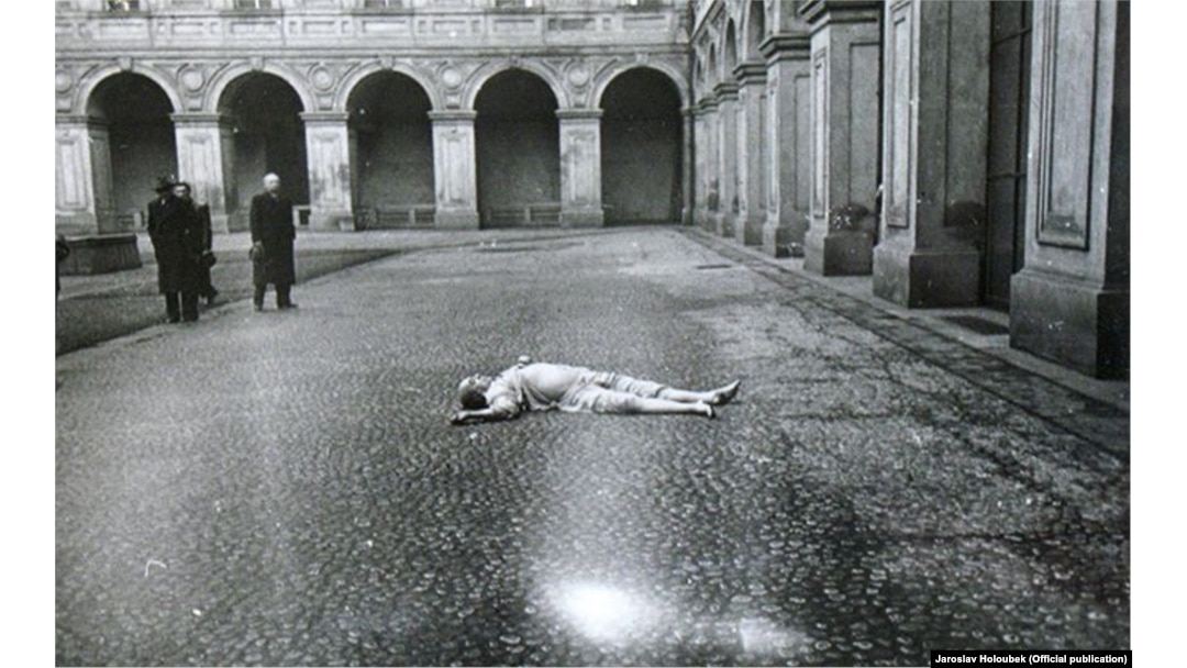 Cadavrul lui Jan Masaryk, descoperit în curtea Ministerului cehoslovac al Afacerilor Externe, descoperit la 10 martie 1948.